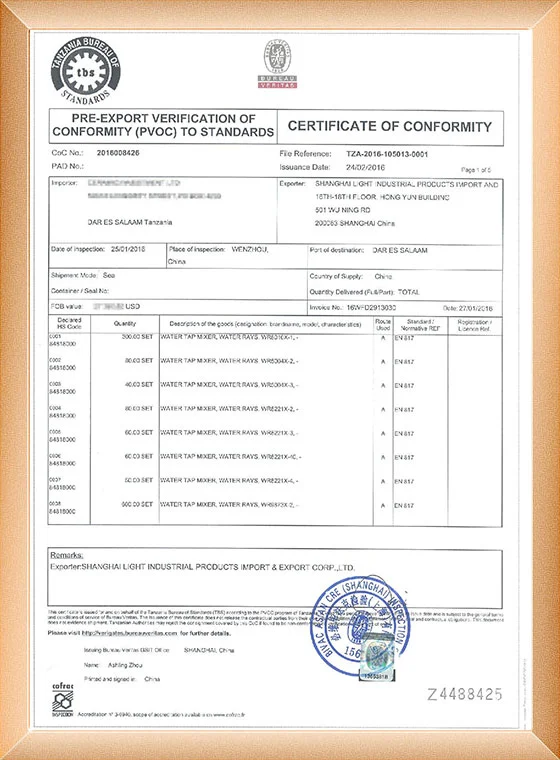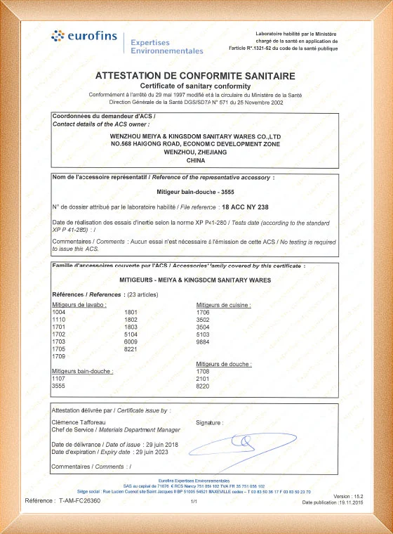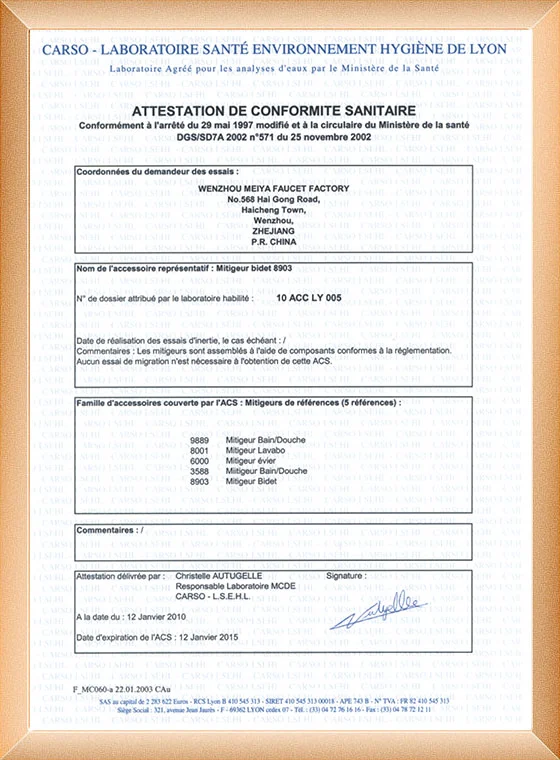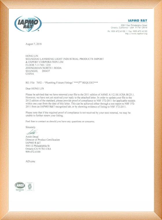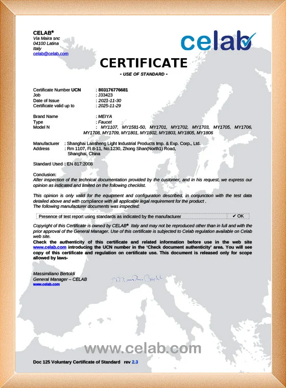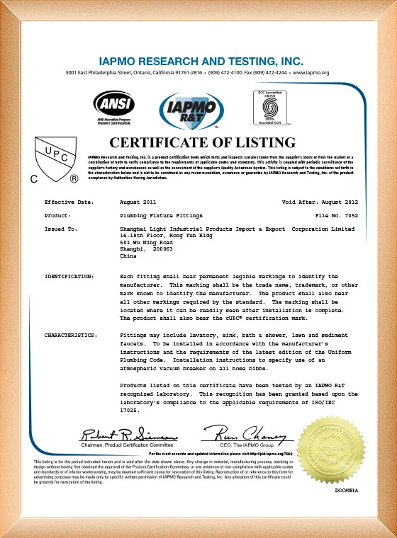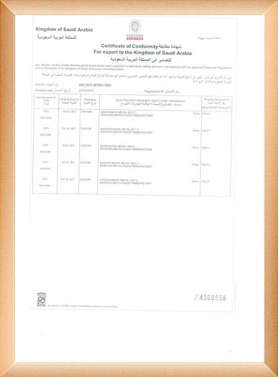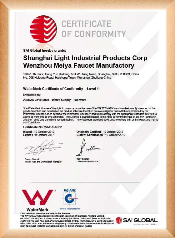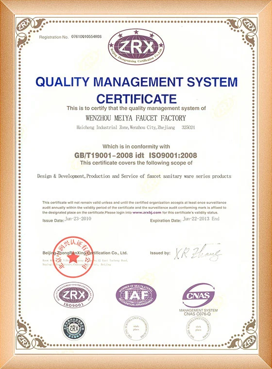 Nuestra fabricación de grifos ha pasado el ISO9001, CE, ACS, CUPC, Watermark, NSF/ANSI, SASO.